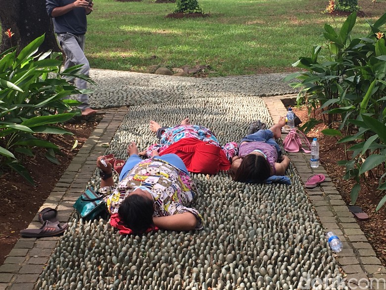 Pantauan detikcom, Selasa (26/12/2017) siang, sejumlah warga tampak menikmati sensasi refleksi di atas batu kerikil. Ada yang berjalan tanpa alas kaki hingga tiduran di atas batu.