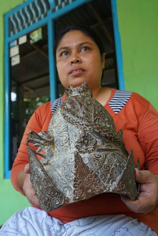 "Pas suami saya mencari pasir untuk pot bunga, anak saya ikut pengin berenang. Waktu masuk air, anak saya melihat kresek seperti isi pampers. Lalu minta bapaknya mengangkat kresek biar dibuang menjauh. Ternyata kresek itu kecantol benda. Dipikir plastik, ternyata ya mahkota ini," ungkapnya.